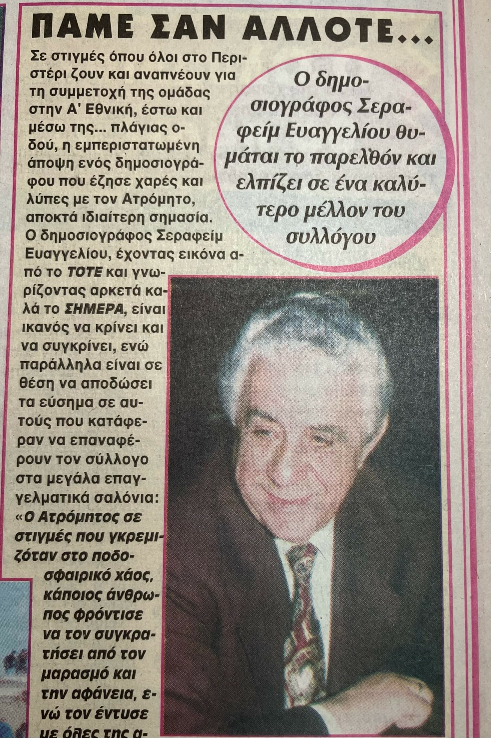 Ιούνιος του 2005 και ως ρεπόρτερ στην εφημερίδα “ΦΩΣ” επιφορτισμένος με το ρεπορτάζ του Ατρόμητου, μεταξύ άλλων επέλεξα δύο ανθρώπους που ένωναν τον Ατρόμητο πριν και μετά τη συγχώνευση. Λίγες μέρες μετά τα γενέθλια του συλλόγου, ήταν ο νέος πρόεδρος της ομάδας του Περιστερίου που θα έδινε πέντε υποσχέσεις για το μέλλον της ομάδας και θα αποτελούσαν οδηγό για τα χρόνια που θα ακολουθούσαν. Παράλληλα, ο δάσκαλος της δημοσιογραφίας και ο παλαιότερος ρεπόρτερ του Ατρόμητου μιλούσε για το αναγεννημένο αστέρι που θα φώτιζε ξανά το Περιστέρι!