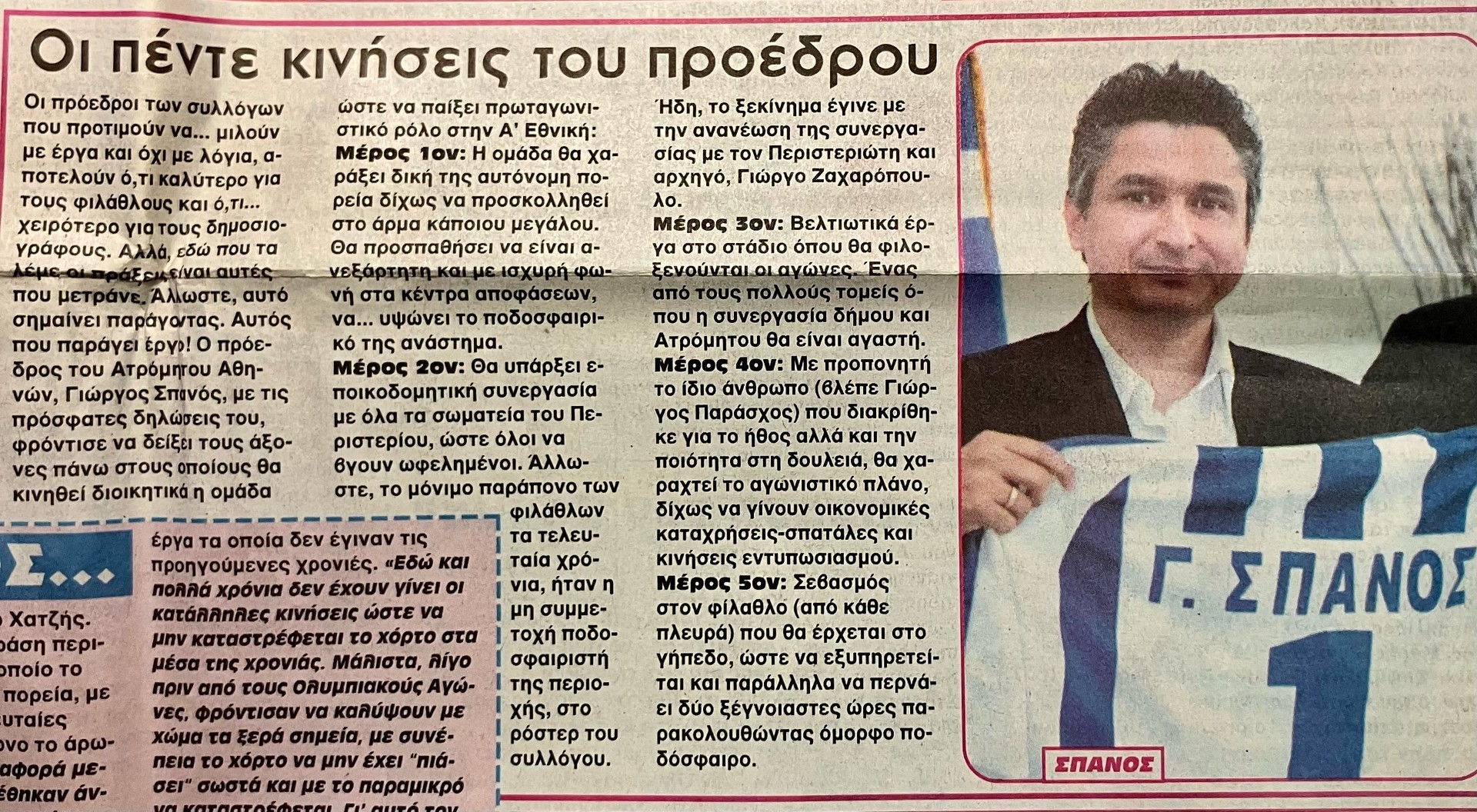 Ιούνιος του 2005 και ως ρεπόρτερ στην εφημερίδα “ΦΩΣ” επιφορτισμένος με το ρεπορτάζ του Ατρόμητου, μεταξύ άλλων επέλεξα δύο ανθρώπους που ένωναν τον Ατρόμητο πριν και μετά τη συγχώνευση. Λίγες μέρες μετά τα γενέθλια του συλλόγου, ήταν ο νέος πρόεδρος της ομάδας του Περιστερίου που θα έδινε πέντε υποσχέσεις για το μέλλον της ομάδας και θα αποτελούσαν οδηγό για τα χρόνια που θα ακολουθούσαν. Παράλληλα, ο δάσκαλος της δημοσιογραφίας και ο παλαιότερος ρεπόρτερ του Ατρόμητου μιλούσε για το αναγεννημένο αστέρι που θα φώτιζε ξανά το Περιστέρι!