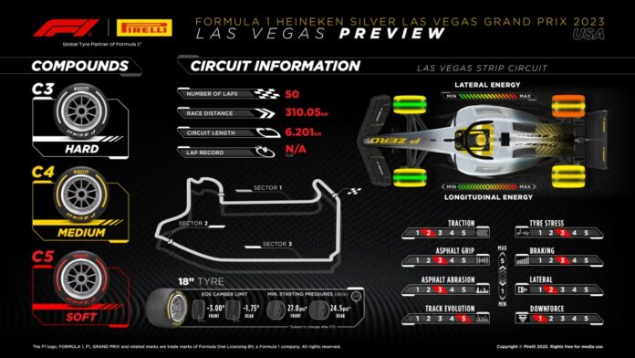 - Σύμφωνα με τον Τζόλιον Πάλμερ, άλλοτε οδηγό της Renault, το σιρκουί του Λας Βέγκας έχει αργές στροφές και μεγάλες ευθείες, αναγκάζοντας την κάθετη δύναμη να παίρνει τροπή που θα δυσκολέψει στα ελαστικά να πιάσουν την επιθυμητή θερμοκρασία και να την διατηρήσουν.