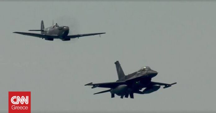Το ανακατασκευασμένο Spitfire MJ755 με ένα F-16, το παρόν και το παρελθόν της πατρίδας μας έσχισαν τον ουρανό της Θεσσαλονίκης.