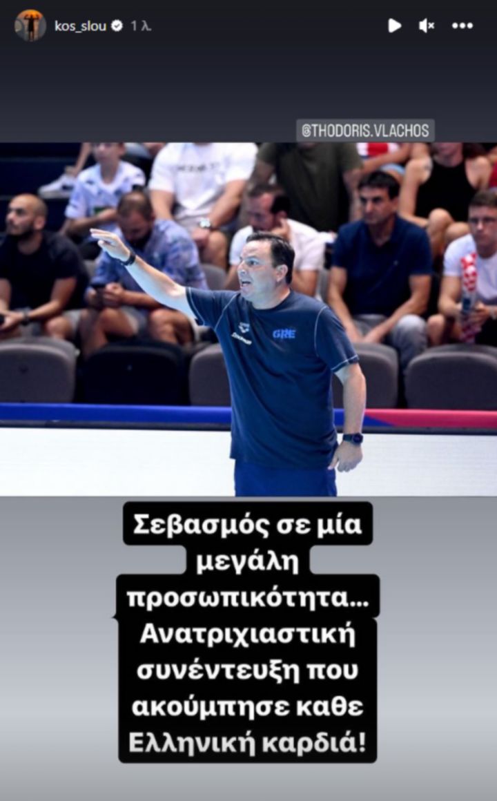 Την υποστήριξή του στην εθνική ομάδα πόλο ανδρών, αλλά και στον ομοσπονδιακό τεχνικό της εξέφρασε μέσω των social media του ο Κώστας Σλούκας, ο οποίος με δυο stories στο Instagram, έπλεξε το εγκώμιο για τον έμπειρο προπονητή αλλά και τη “γαλανόλευκη” γενικά.//Γ.