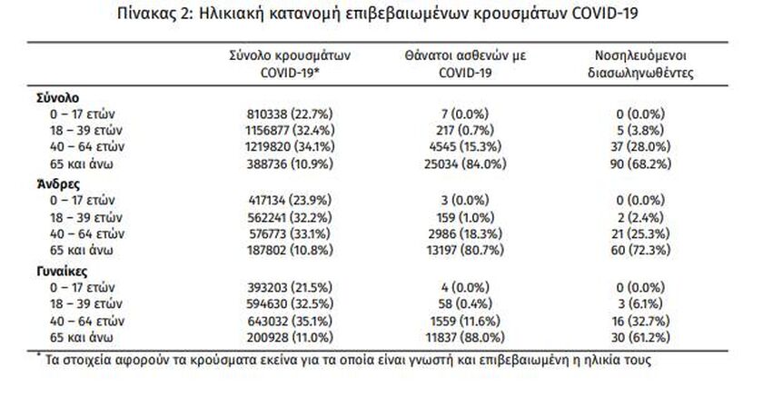 «Τα νέα εργαστηριακά επιβεβαιωμένα κρούσματα της νόσου (άτομα) που καταγράφηκαν τις τελευταίες 24 ώρες ήταν 2.575. Ο συνολικός αριθμός των ατόμων που νόσησαν ανέρχεται σε 3.445.538 (ημερήσια μεταβολή +0.1%), εκ των οποίων 48.8% άνδρες.