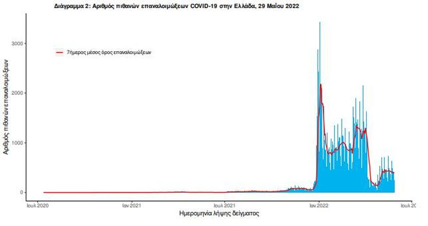 Ο αριθμός πιθανών νέων επαναλοιμώξεων που καταγράφηκαν τις τελευταίες 24 ώρες ήταν 272 ενώ από την αρχή της πανδημίας SARS-CoV-2 ο συνολικός αριθμός εκτιμάται σε 134.818(3.8% του συνολικού αριθμού των θετικών αποτελεσμάτων).