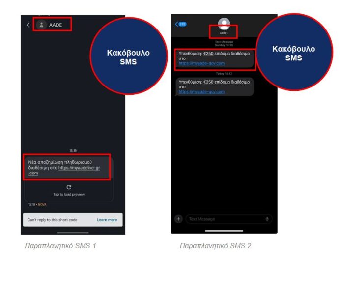 “Το τελευταίο διάστημα διαπιστώθηκαν κακόβουλες ενέργειες αποστολής παραπλανητικών μηνυμάτων SMS σε κινητές συσκευές (SMISHING), με στόχο την υποκλοπή προσωπικών στοιχείων πολιτών και στοιχείων τραπεζικών καρτών, μέσω πλαστών ιστοσελίδων”, αναφέρει ανακοίνωση της Ανεξάρτητης Αρχής Δημοσίων Εσόδων (ΑΑΔΕ). Η ΑΑΔΕ έχει προβεί σε όλες τις απαραίτητες ενέργειες αναφοράς και διακοπής λειτουργίας των εν λόγω ιστοσελίδων.