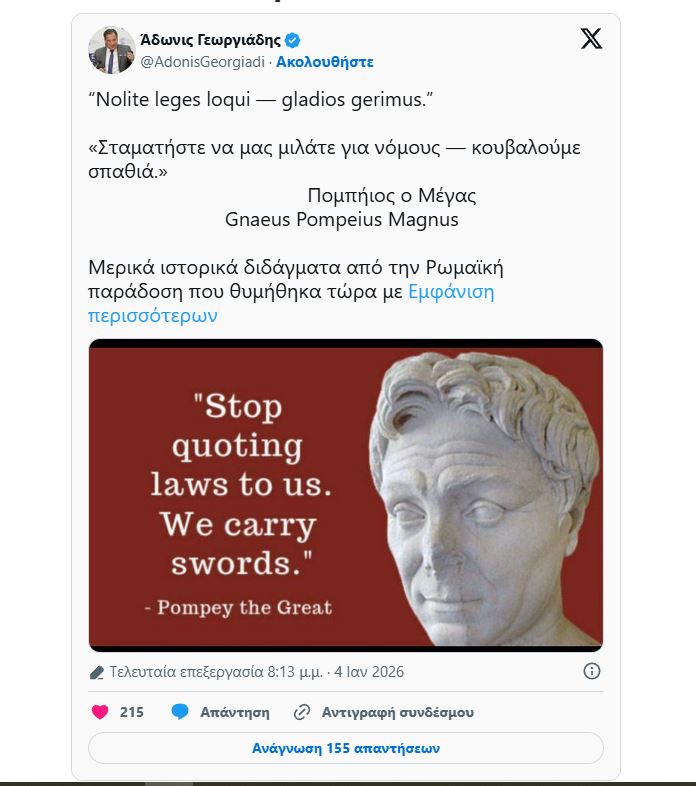 Υπενθυμίζεται ότι σε ανάρτησή του στο X, ο υπουργός Υγείας αν και αποφεύγει να αναφερθεί στη Βενεζουέλα και τις ΗΠΑ, υιοθέτησε τη φράση «Nolite leges loqui – gladios gerimus» («Σταματήστε να μας μιλάτε για νόμους – κουβαλούμε σπαθιά»), αποδίδοντάς την στον Πομπήιο τον Μέγα.