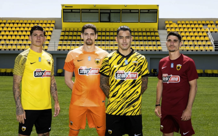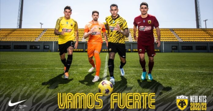 Εντυπωσιακές και πρωτότυπες είναι οι φανέλες που θα φοράνε οι ποδοσφαιριστές της ΑΕΚ τη νέα σεζόν, όπως γνωστοποίησε με φωτογραφίες η «κιτρινόμαυρη» ΠΑΕ στα social medai με ισπανόφωνο σύνθημα «Vamos Fuerte» (μτφ: «Πάμε δυνατά»). Πρόκειται για τις εμφανίσεις με τις οποίες οι ποδοσφαιριστές της Ένωσης θα μπουν στην «OPAP Arena».