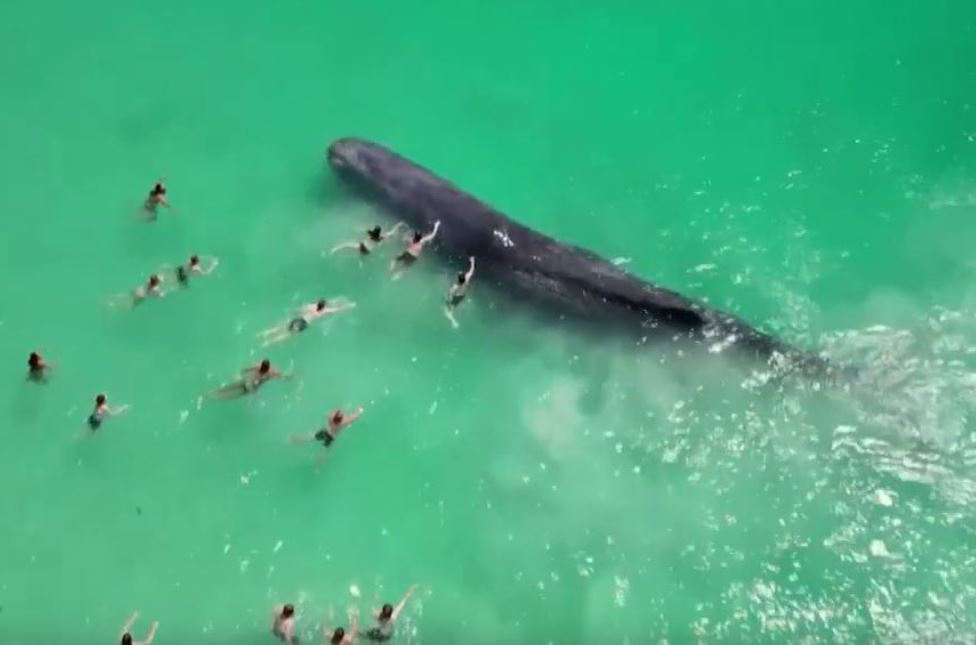 Στις εικόνες, η φάλαινα φαίνεται να έχει φτάσει σε ρηχά νερά και να τραβάει την προσοχή των λουόμενων, πριν επιστρέψει σε βαθιά νερά.