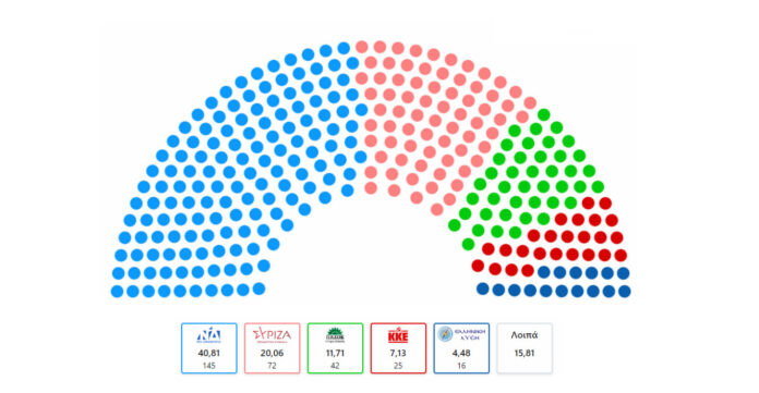 Το κόμμα του Κυριάκου Μητσοτάκη συγκεντρώνει ποσοστό 40,8%, ποσοστό που είναι υπερδιπλάσιο του ΣΥΡΙΖΑ τα ποσοστά του οποίου καταρρέουν στο 20,06%. Όπως έγινε γνωστό, μάλιστα, λίγο πριν τις 10 το βράδυ, ο Αλέξης Τσίπρας τηλεφώνησε στον Κυριάκο Μητσοτάκη και τον συνεχάρη για τη νίκη του. Λίγο πριν τις 22:30 στον Κυριάκο Μητσοτάκη για τον συγχαρεί για τη νίκη του τηλεφώνησε και ο Νίκος Ανδρουλάκης.