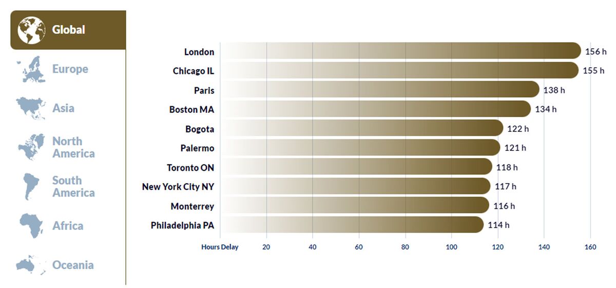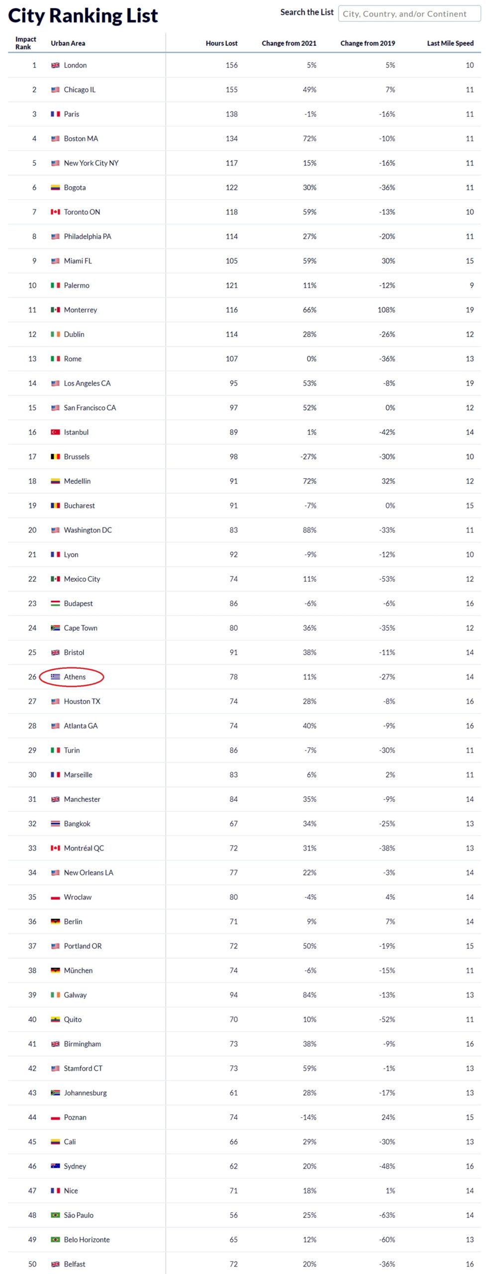 Σύμφωνα με μια έρευνα που πραγματοποίησε η εταιρεία INRIX δεν είναι μεταξύ των δέκα πιο επιβαρυμένων κυκλοφοριακά πόλεις στην Ευρώπη. Όπου τα σκήπτρα κρατούν το Λονδίνο και το Παρίσι, που είναι και από τις πιο μεγάλες πληθυσμιακά, ενώ η έκπληξη είναι το… Παλέρμο που βρίσκεται στην 3η θέση. Και εδώ οι αιτίες θα είναι και άλλες πέρα από τη συγκέντρωση πληθυσμού.
