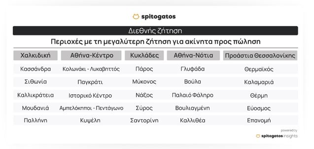 Εστιάζοντας στην περιοχή του κέντρου της Αθήνας, οι περιοχές που συγκέντρωσαν το μεγαλύτερο ενδιαφέρον είναι το Κολωνάκι-Λυκαβηττός, το Παγκράτι, το Ιστορικό κέντρο, η περιοχή Αμπελόκηποι-Πεντάγωνο και η Κυψέλη. Την πρωτιά στις Κυκλάδες παίρνει η Πάρος, σε ό,τι αφορά τη διεθνή ζήτηση ακινήτων προς πώληση το 2023, ενώ ακολούθησαν η Μύκονος, η Νάξος, η Σύρος και η Σαντορίνη. Στα προάστια της Θεσσαλονίκης, ο Θερμαϊκός, η Καλαμαριά, η Θέρμη, ο Εύοσμος και η Επανομή αποτέλεσαν τις δημοφιλέστερες περιοχές για αγορά ακινήτου για τους ενδιαφερόμενους από το εξωτερικό. Στα Νότια Προάστια της Αττικής, το ενδιαφέρον της διεθνούς ζήτησης για ακίνητα προς πώληση επικεντρώθηκε στη Γλυφάδα, τη Βούλα, το Παλαιό Φάληρο, τη Βουλιαγμένη αλλά και την Καλλιθέα