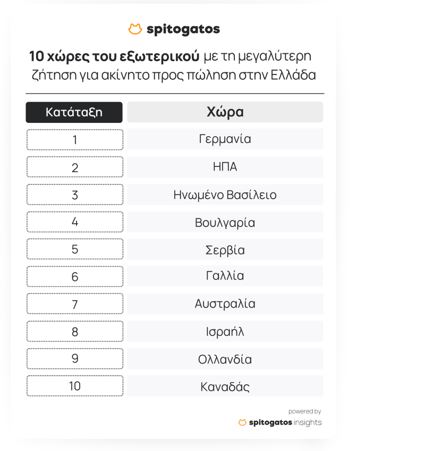 Αυξημένη κατά 5% σε σχέση το 2022 ήταν η διεθνής ζήτηση για ακίνητα προς πώληση στην Ελλάδα το 2023. Οι χώρες από όπου προήλθε το πιο έντονο ενδιαφέρον για αγορά ακινήτου στην Ελλάδα το 2023 είναι η Γερμανία, οι Ηνωμένες Πολιτείες της Αμερικής και το Ηνωμένο Βασίλειο, ενώ αξιοσημείωτη είναι η ζήτηση για αγορά ακινήτων που προέρχεται από γειτονικές χώρες των Βαλκανίων, όπως η Σερβία, η Βόρεια Μακεδονία αλλά και η Βουλγαρία.