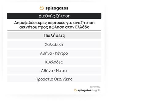 Τις δημοφιλέστερες περιοχές για αγορά ακινήτων και ενοικίαση παρουσιάζει το Spitogatos. Όπως επισημαίνεται, οι πιο δημοφιλείς περιοχές για αγορά κατοικίας το 2023 πανελλαδικά ήταν τα Προάστια της Θεσσαλονίκης, τα Νότια Προάστια και το κέντρο της Αθήνας, τα Βόρεια Προάστια της Αθήνας και ο Δήμος Θεσσαλονίκης. Οι δημοφιλέστερες κατηγορίες κατοικιών προς πώληση για τους Έλληνες το 2023 ήταν οι μονοκατοικίες, τα διαμερίσματα και τα στούντιο.
