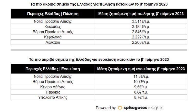 Πίνακας 3: Τα πιο ακριβά σημεία της Ελλάδας για πώληση κατοικιών το δεύτερο τρίμηνο 2023