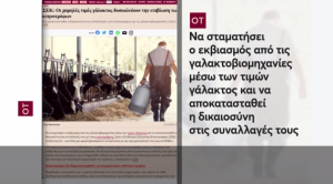 «Να σταματήσει ο εκβιασμός από τις γαλακτοβιομηχανίες μέσω των τιμών γάλακτος και να αποκατασταθεί η δικαιοσύνη στις συναλλαγές τους με τους κτηνοτρόφους, ζητά ο Σύνδεσμος Ελληνικής Κτηνοτροφίας (ΣΕΚ), τονίζοντας ότι ‘για άλλη μια φορά βρισκόμαστε αντιμέτωποι με μια πραγματικότητα που μας συνθλίβει’», όπως αναφέρει ο «Οικονομικός Ταχυδρόμος».