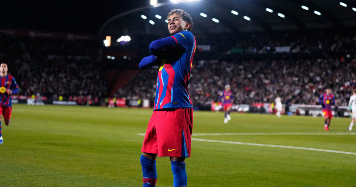 Ο Γιαμάλ πανηγυρίζει το γκολ του κόντρα στην Αλμπαθέτε/ (AP Photo/Manu Fernandez)