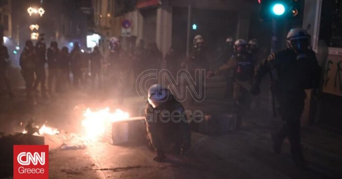 Περίπου 1.000 άτομα αποσπάστηκαν από το σώμα της πορείας στις 20.15 και κινήθηκαν κινήθηκαν κατά ομάδες μέσω της οδού Μπενάκη προς την περιοχή των Εξαρχείων, στήνοντας οδοφράγματα με αντικείμενα και κάδους, στους οποίους έθεσαν φωτιά.
