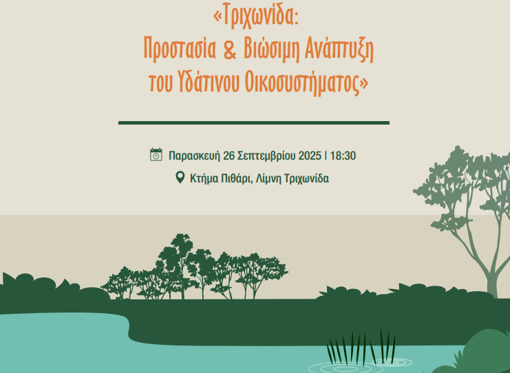 Εκδήλωση με θέμα: “Τριχωνίδα: Προστασία & Βιώσιμη Ανάπτυξη του Υδάτινου Οικοσυστήματος”, διοργανώνει η Περιφέρεια Δυτικής Ελλάδας, την Παρασκευή 26 Σεπτεμβρίου 2025 και ώρα 18.30 στη λίμνη Τριχωνίδα (Κτήμα Πιθάρι), στο πλαίσιο της πρωτοβουλίας “Οικονομική Υποστήριξη Εξωστρεφών Δράσεων 2025” του Πράσινου Ταμείου.