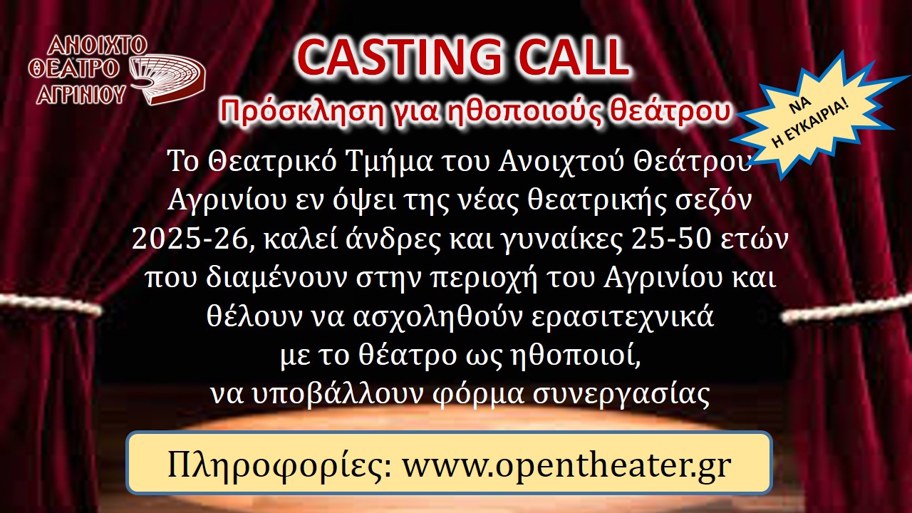 Το Θεατρικό Τμήμα Ανοιχτού Θεάτρου Αγρινίου, εν όψει της νέας θεατρικής σεζόν 2025-26, απευθύνει πρόσκληση σε άνδρες και γυναίκες, ερασιτέχνες ηθοποιούς, ηλικίας 25-50 ετών από την περιοχή του Αγρινίου, για τη νέα του θεατρική παράσταση.