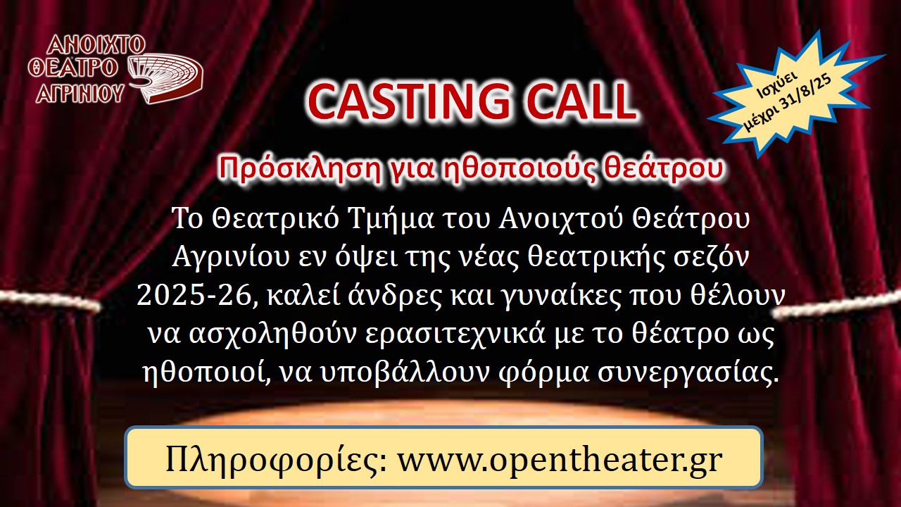 Το Θεατρικό Τμήμα Ανοιχτού Θεάτρου Αγρινίου, αναζητά άνδρες και γυναίκες, ερασιτέχνες ηθοποιούς ή και άτομα που θέλουν να ασχοληθούν για πρώτη φορά με το θέατρο, για την νέα του θεατρική σεζόν 2025-26.