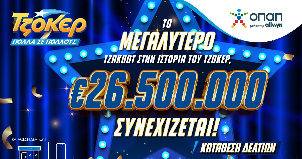 Κόβει την ανάσα το ποσό που κληρώνει το ΤΖΟΚΕΡ στην αυριανή κλήρωση, καθώς ανέρχεται σε 26,5 εκατ. ευρώ και αποτελεί το μεγαλύτερο έπαθλο στα χρονικά του παιχνιδιού.