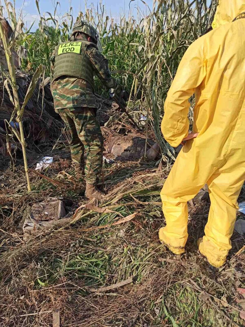 Για δεύτερο 24ώρο το Τάγμα Εκκαθάρισης Ναρκοπεδίων Ξηράς συνέχισε με τον εντοπισμό και τη σήμανση πυρομαχικών που έχουν διασκορπιστεί από τα συντρίμμια του αεροσκάφους. Στη συνέχεια, θα ακολουθήσει συγκέντρωση και απομάκρυνση ή επί τόπου εξουδετέρωσή τους, κάτι που θα κριθεί από το κλιμάκιο.Υπενθυμίζεται, πως δεν εντοπίστηκε στην περιοχή καμία επικίνδυνη ουσία.