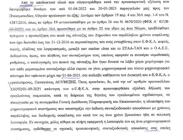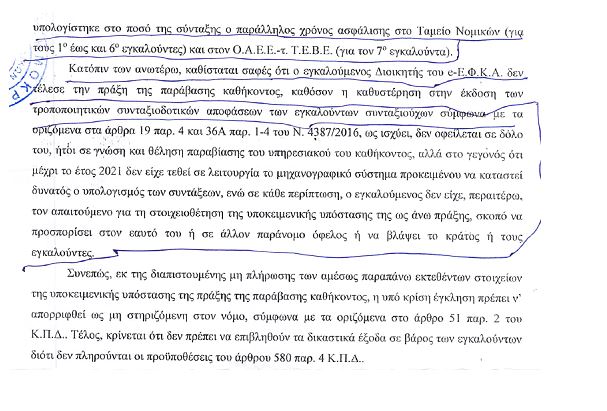 Στην συνέχεια μη έχοντας καμμιά απάντηση, την 01/09/2021 κατέθεσε το Δίκτυο εξώδικη δήλωση κατά του Διοικητή e-ΕΦΚΑ και τότε δεν πήρε απάντηση. Μετά από αυτό το Δίκτυο κατέθεσε την προαναφερόμενη μηνυτήρια αναφορά για την οποία σας παραθέτουμε αποσπάσματα της διάταξης, όπου αναγκάστηκε ο Διοικητής του e-ΕΦΚΑ να εφαρμόσει το νόμο με αποτέλεσμα να δοθεί η προσαύξηση στην ήδη υπάρχουσα σύνταξη να βγει τροποιητική απόφαση και να λάβουν τα αναδρομικά από το 2016 οι δικαιούχοι με μέσο όρο αύξησης της σύνταξης 470 Ευρώ το μήνα.