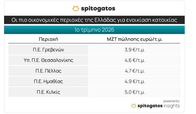 Σε ό,τι αφορά την ενοικίαση κατοικίας, οι πιο οικονομικές περιοχές της χώρας για το πρώτο τρίμηνο του 2026 αναδείχθηκαν η Π.Ε. Γρεβενών με ΜΖΤ ενοικίασης στα 3,9 ευρώ/τ.μ., ενώ ακολουθούν το υπόλοιπο της Π.Ε. Θεσσαλονίκης, η Π.Ε. Πέλλας, η Π.Ε. Ημαθίας και η Π.Ε. Κιλκίς.