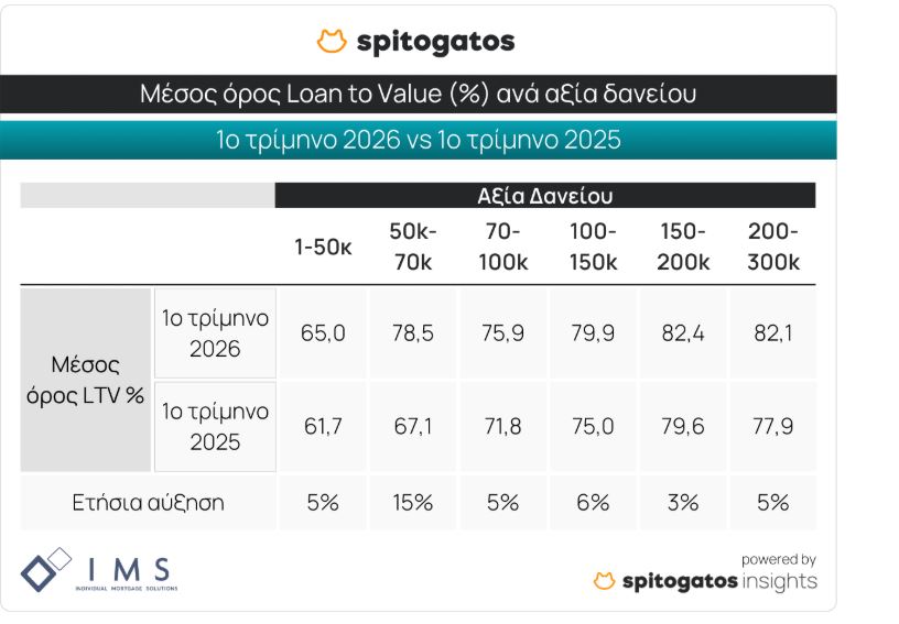 Είναι σημαντικό να σημειωθεί ότι ο δείκτης LTV είναι αυξημένος κατά το 1ο τρίμηνο του 2026 σε όλες τις βαθμίδες αξίας δανείου, με τη σημαντικότερη αύξηση να σημειώνεται στη βαθμίδα 50-70 χιλιάδες ευρώ.