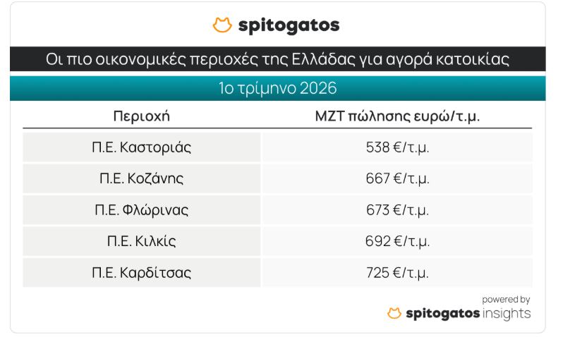 Στον αντίποδα, οι πιο οικονομικές περιοχές της χώρας για αγορά κατοικίας είναι οι εξής: η Π.Ε. Καστοριάς με ΜΖΤ πώλησης στα 538 ευρώ/τ.μ., η Π.Ε. Κοζάνης, η Π.Ε. Φλώρινας, η Π.Ε. Κιλκίς και η Π.Ε. Καρδίτσας.