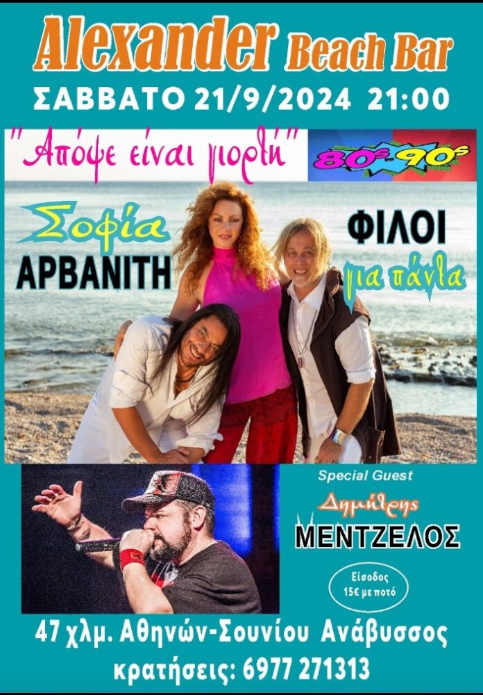 Απόψε είναι Γιορτή στο Alexander Beach Bar με την μοναδική Σοφία Αρβανίτη, φίλοι για πάντα και Δημήτρη Μεντζέλο.