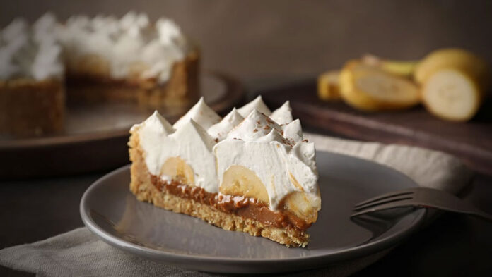Θρυμματίστε τα κομματάκια μπανάνας χρησιμοποιώντας έναν πλάστη σε μια σανίδα κοπής. Κατεβάστε την κατσαρόλα από τη φωτιά και ανακατέψτε τα περισσότερα από τα κομματάκια μπανάνας, στη συνέχεια απλώστε το μείγμα πάνω από τη στρώση μπανάνας και βάλτε το στο ψυγείο για τουλάχιστον 4 ώρες για να σταθεροποιηθεί.
