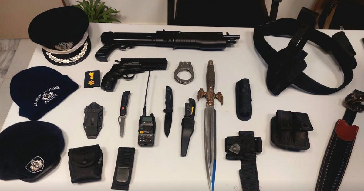 Επίσης στην κατοχή του εντοπίστηκαν αεροβόλα όπλα, μαχαίρια, ξίφος, χειροπέδες κ.α.