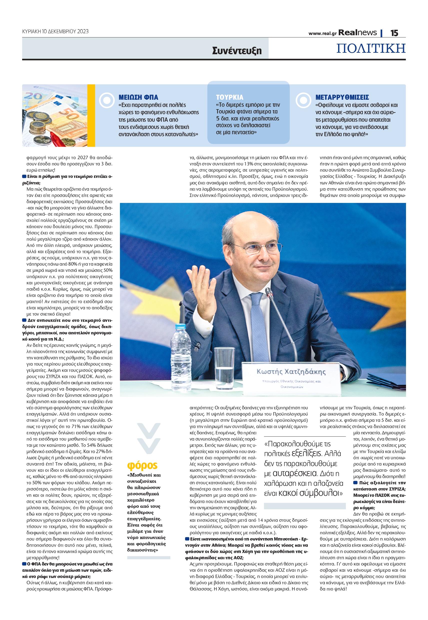 Επίσης, προσθέτει πως «είναι σαφές ότι μιλάμε για έναν νόμο κοινωνικής και φορολογικής δικαιοσύνης». Ο Κ. Χατζηδάκης απαντά σε όσους αντιδρούν στο νέο φορολογικό και επισημαίνει πως σύμφωνα με τις μετρήσεις η μεγάλη πλειονότητα της κοινωνίας συμφωνεί με την κατεύθυνση της ρύθμισης. «Αυτό, πιστεύω, συμβαίνει διότι ακόμη και εκείνοι που σήμερα μπορεί να διαφωνούν, αναγνωρίζουν τελικά ότι δεν ξύπνησε κάποια μέρα η κυβέρνηση και αποφάσισε να επιβάλει ένα νέο σύστημα φορολόγησης των ελεύθερων επαγγελματιών», αναφέρει χαρακτηριστικά. Ο υπουργός Οικονομικών μιλά και για τη συνάντηση Μητσοτάκη – Ερντογάν και υποστηρίζει πως «δημιουργείται ένα θετικό μομέντουμ στις σχέσεις μας με την Τουρκία και ελπίζω ότι -χωρίς ποτέ να υποχωρούμε από τα κυριαρχικά μας δικαιώματα- αυτό το μομέντουμ θα διατηρηθεί».