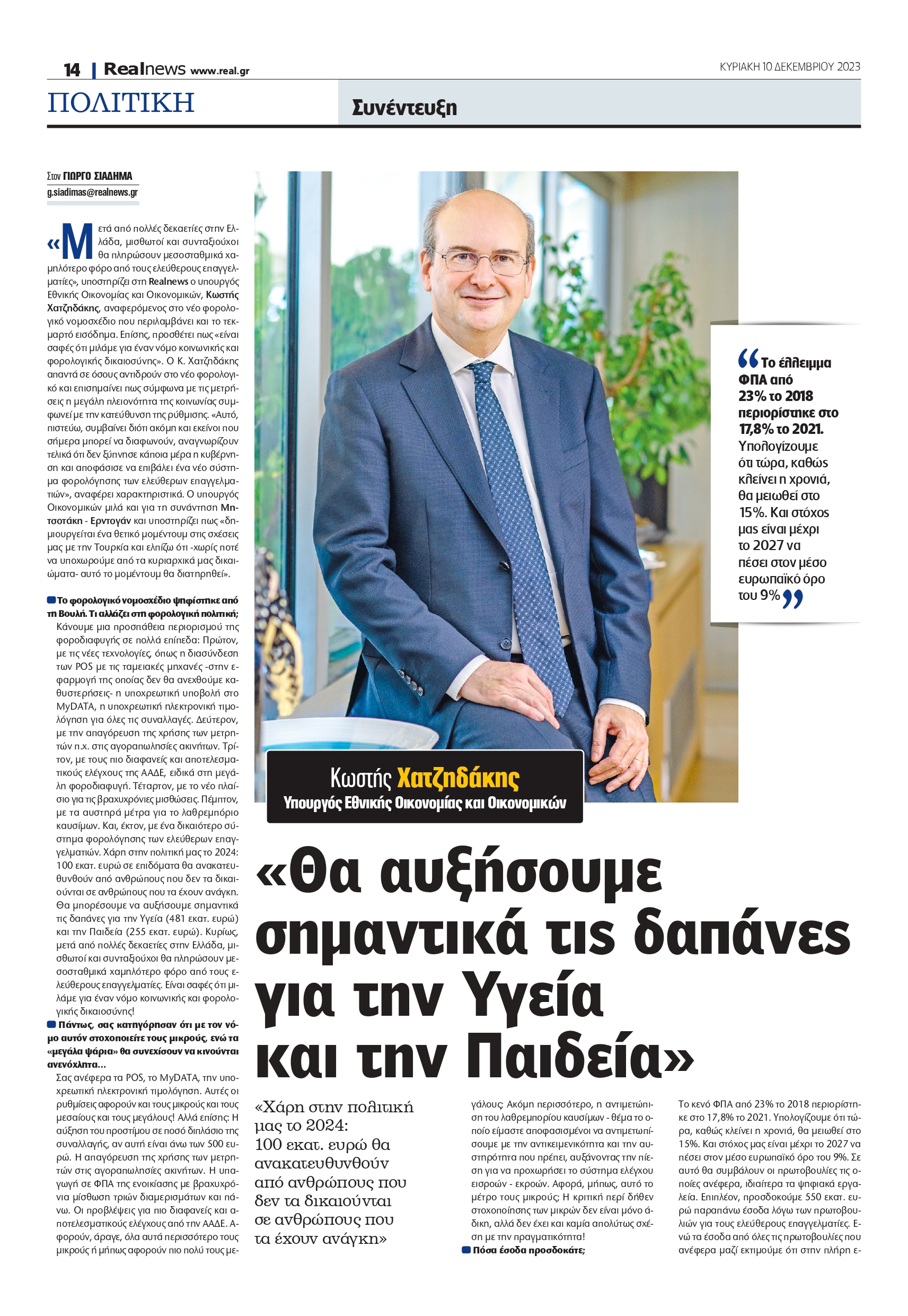 Επίσης, προσθέτει πως «είναι σαφές ότι μιλάμε για έναν νόμο κοινωνικής και φορολογικής δικαιοσύνης». Ο Κ. Χατζηδάκης απαντά σε όσους αντιδρούν στο νέο φορολογικό και επισημαίνει πως σύμφωνα με τις μετρήσεις η μεγάλη πλειονότητα της κοινωνίας συμφωνεί με την κατεύθυνση της ρύθμισης. «Αυτό, πιστεύω, συμβαίνει διότι ακόμη και εκείνοι που σήμερα μπορεί να διαφωνούν, αναγνωρίζουν τελικά ότι δεν ξύπνησε κάποια μέρα η κυβέρνηση και αποφάσισε να επιβάλει ένα νέο σύστημα φορολόγησης των ελεύθερων επαγγελματιών», αναφέρει χαρακτηριστικά. Ο υπουργός Οικονομικών μιλά και για τη συνάντηση Μητσοτάκη – Ερντογάν και υποστηρίζει πως «δημιουργείται ένα θετικό μομέντουμ στις σχέσεις μας με την Τουρκία και ελπίζω ότι -χωρίς ποτέ να υποχωρούμε από τα κυριαρχικά μας δικαιώματα- αυτό το μομέντουμ θα διατηρηθεί».