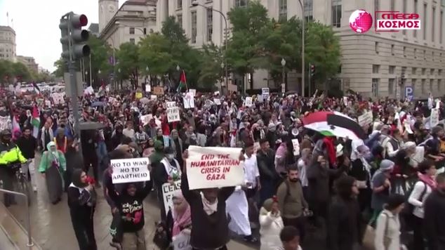 Στην Ουάσιγκτον, εκατοντάδες διαδηλωτές, φωνάζοντας συνθήματα και κρατώντας πλακάτ υπέρ του παλαιστινιακού λαού, κατευθύνονται προς το Καπιτώλιο. Ζητούν την άμεση κατάπαυση του πυρός στην Γάζα.