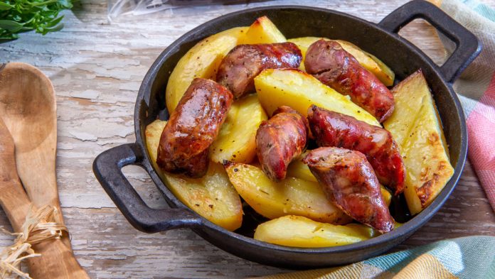 Αμέσως μετά ανοίγουμε το καλάθι, προσθέτουμε και το λουκάνικο και ψήνουμε για ακόμα 5 λεπτά στους 200 °C.