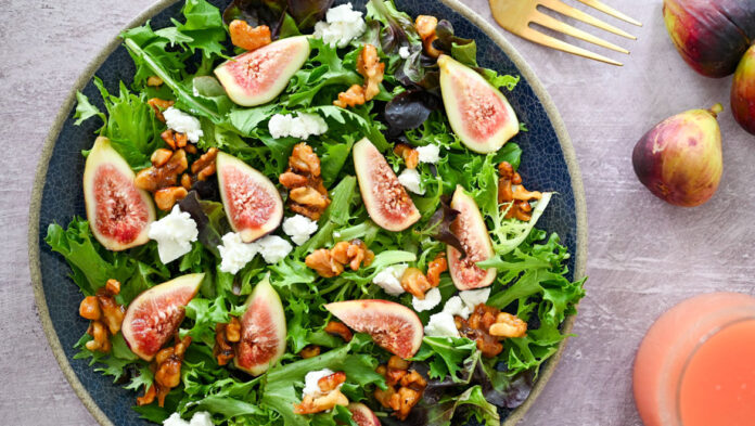 Σε μια μεγάλη σαλατιέρα ρίχνεις την πράσινη σαλάτα, τα ντοματίνια, τα σύκα, τα cranberries και τα καρύδια