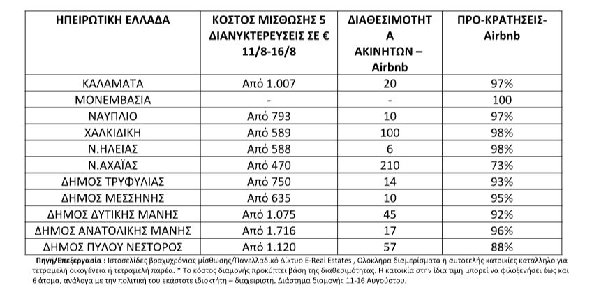Παράλληλα, στο Δήμο Μεσσήνης, η δυναμική των εγγεγραμμένων ακινήτων σε πλατφόρμες βραχυχρόνιας μίσθωσης αριθμεί 320 ακίνητα, με τις προ-κρατήσεις για το πενθήμερο του Δεκαπενταύγουστου να αγγίζουν το 95% στην πλατφόρμα Airbnb. Το κόστος μίσθωσης κατοικίας κατάλληλη για τετραμελή παρέα ή/και οικογένεια στη περιοχή Άγιος Ανδρέας αγγίζει τα 635 ευρώ για 5 διανυκτερεύσεις. Στον Δήμο Ανατολικής Μάνης, η δυναμική των εγγεγραμμένων ακινήτων σε πλατφόρμες βραχυχρόνιας μίσθωσης αριθμεί 515 ακίνητα, με τις προ-κρατήσεις για το πενθήμερο του Δεκαπενταύγουστου να αγγίζουν το 96% στην πλατφόρμα Airbnb. Το κόστος μίσθωσης κατοικίας κατάλληλη για εξαμελή παρέα ή/και οικογένεια στην ευρύτερη περιοχή του Γυθείου αγγίζει τα 1.716€ για 5 διανυκτερεύσεις. Το κόστος μίσθωσης, αφορά κατοικία 3υπνοδωματίων με 3μπάνια.
