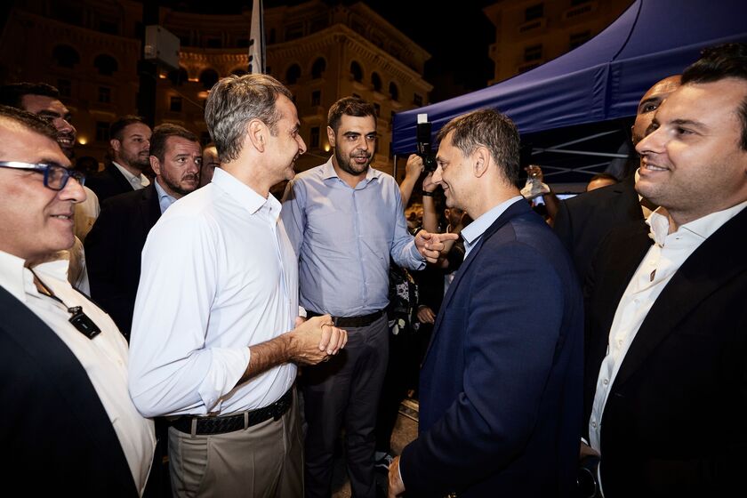 Στη συνέχεια κατευθύνθηκε στην πλατεία Αριστοτέλους, όπου βρίσκεται το περίπτερο της Νέας Δημοκρατίας, το οποίο στήθηκε για τις μέρες της 86ης ΔΕΘ.