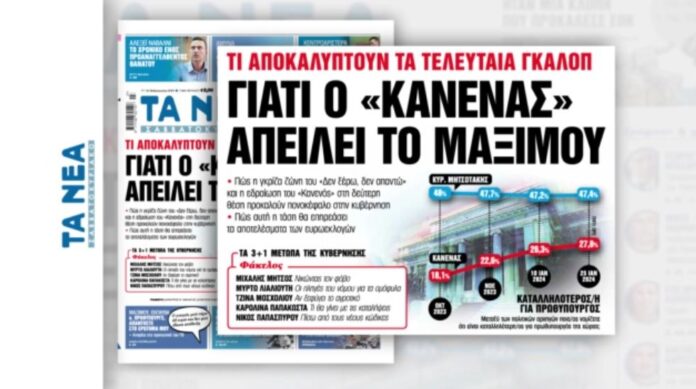 Πράγματι «Τα Νέα» στο πρωτοσέλιδό τους αναφέρουν ότι σύμφωνα με τα τελευταία γκάλοπ ο “Κανένας” απειλεί το Μαξίμου.