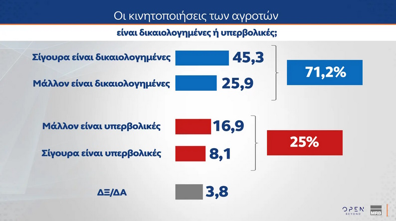 Αντίστοιχα, στη δημοσκόπηση της MRB, το 79,9% λέει ότι είναι δίκαια τα αιτήματα των αγροτών ενώ το 15,6% έχει διαφορετική άποψη. Δικαιολογημένες χαρακτηρίζει τις κινητοποιήσεις των αγροτών το 71,2% ενώ υπερβολικές τις κρίνει το 25%.