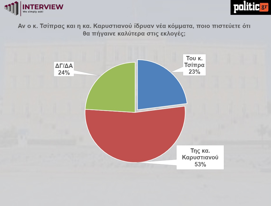 Οι πολίτες ερωτώνται ποιο νέο κόμμα πιστεύουν ότι θα πήγαινε καλύτερα στις εκλογές, σε περίπτωση που ιδρυόταν είτε από τον Αλέξη Τσίπρα είτε από τη Μαρία Καρυστιανού.