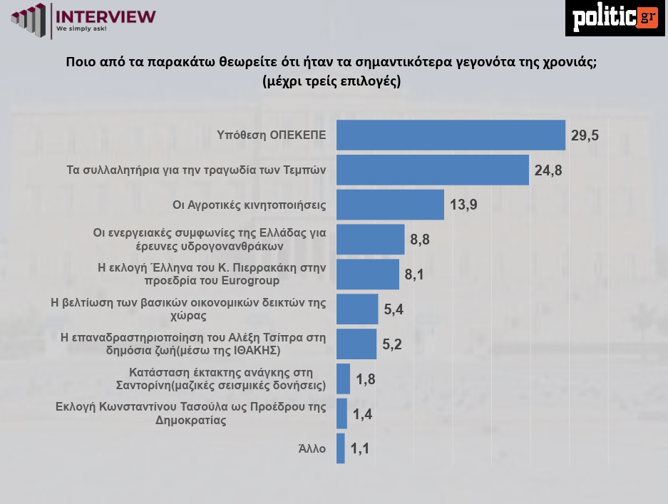 Η υπόθεση ΟΠΕΚΕΠΕ και τα συλλαλητήρια για την τραγωδία των Τεμπών αναδεικνύονται ως τα σημαντικότερα γεγονότα της χρονιάς, καταλαμβάνοντας τις 2 πρώτες θέσεις με συνολικό ποσοστό άνω του 50%.