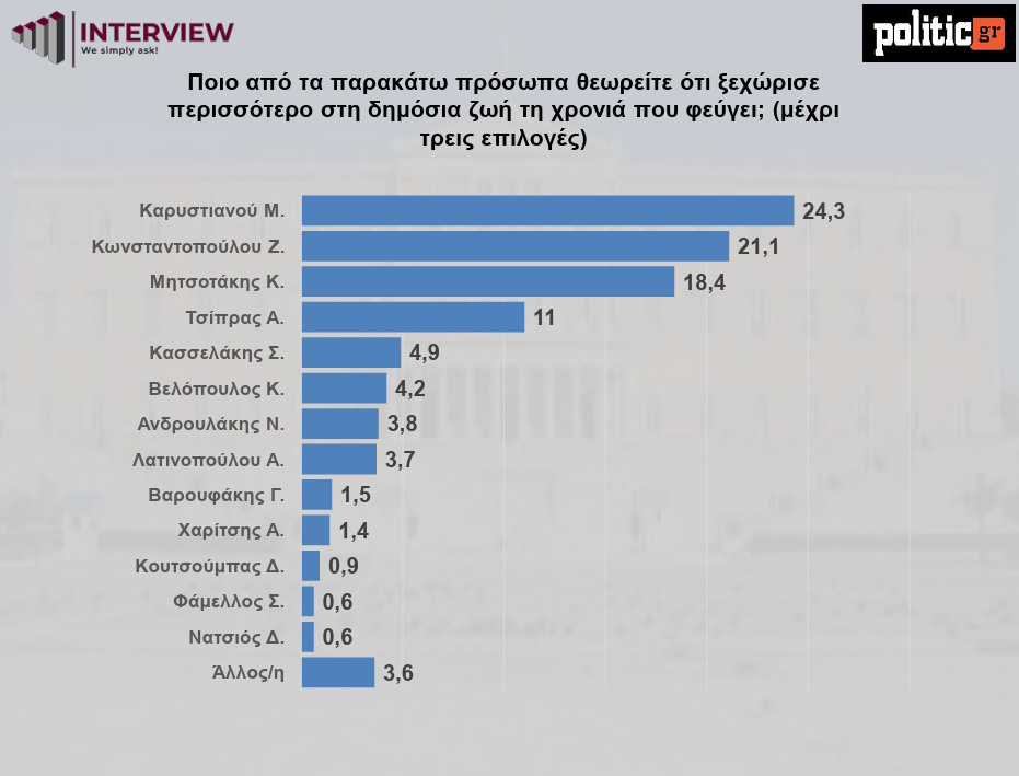 Η Μαρία Καρυστιανού καταγράφει το υψηλότερο ποσοστό (24,3%) μεταξύ των προσώπων που ξεχώρισαν περισσότερο στη δημόσια ζωή τη χρονιά που φεύγει. Στη δεύτερη θέση ακολουθεί η Ζωή Κωνσταντοπούλου (21,1%), επιβεβαιώνοντας τη σταθερή θέση της στον δημόσιο πολιτικό διάλογο.