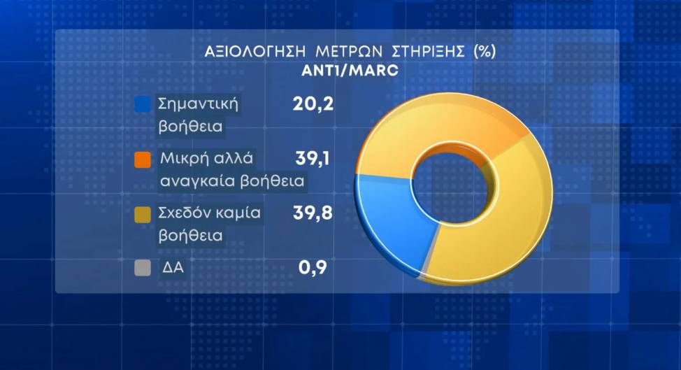 Σχετικά με τα μέτρα στήριξης που έχει λάβει η κυβέρνηση, το 39,8% θεωρεί πως είναι «σχεδόν καμία βοήθεια», το 39,1% «μικρή, αλλά αναγκαία βοήθεια» και το 20,2% «σημαντική βοήθεια».