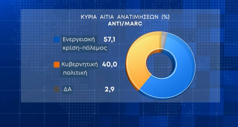 Η κύρια αιτία των ανατιμήσεων, όπως κρίνουν οι πολίτες, είναι η ενεργειακή κρίση και ο πόλεμος με ποσοστό 57,1%, ενώ ακολουθεί η κυβερνητική πολιτική με 40%.