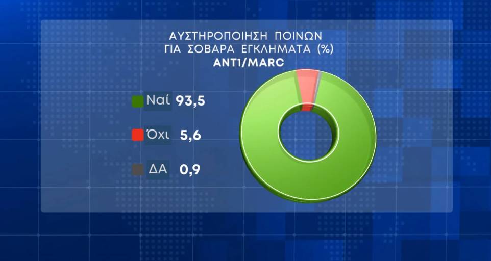 Ως προς τα σοβαρά εγκλήματα, η συντριπτική πλειοψηφία των συμμετεχόντων στην έρευνα ζητεί αυστηροποίηση των ποινών σε ποσοστό 93,5%. Όχι, απαντά το 5,6%.