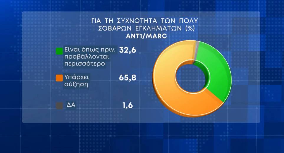 Το 65,8% των ερωτηθέντων θεωρεί πως υπάρχει αύξηση των πολύ σοβαρών εγκλημάτων, ενώ το 32,6% απαντά πως είναι όπως πριν, απλά προβάλλονται περισσότερο.