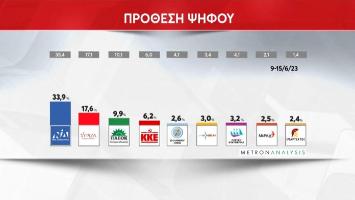 Στην πρόθεση ψήφου η Νέα Δημοκρατία λαμβάνει ποσοστό 33,9%, χάνοντας από την προηγούμενη μέτρηση της ίδιας εταιρείας 1,5 μονάδα, με τον ΣΥΡΙΖΑ να βρίσκεται μόλις στο 17,6%, αλλά 0.5% πάνω σε σχέση με την προηγούμενη εβδομάδα και τη διαφορά να υποχωρεί από τις 18,3 μονάδες στις 16,3 μονάδες.
