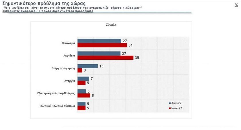 Με ποσοστό 27% η οικονομία μαζί με την ακρίβεια αποτελούν το σημαντικότερο πρόβλημα που απασχολεί τους πολίτες, ενώ ακολουθούν η ενεργειακή κρίση με 13%, η ανεργία με 7%, η εξωτερική πολιτική και ο πόλεμος με 7%.